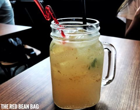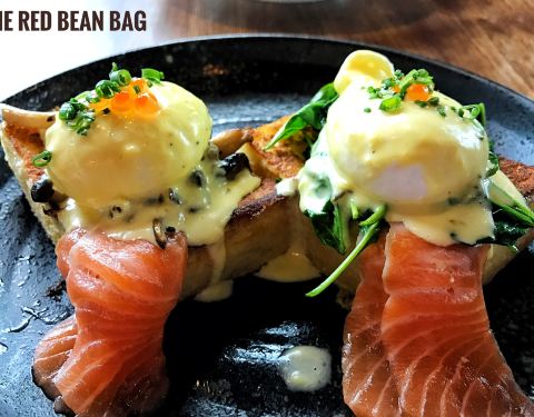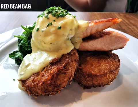THE RED BEAN BAG坐落在楼上,风景也很棒,树木郁郁葱葱的,店里的音乐也很棒,有点西部牛仔的风格,门口很多麻袋里装着各种各样的咖啡豆,感觉像美国小镇的餐厅,牛仔们歇脚的地方,整间店的装修都比较简约,凳子也是那种铁的硬座椅,服务员的穿着给人很干练的感觉,里面有龙爪生菜,生菜,松子,切好的橙子,牛油果,还有橄榄等,特别健康的一道菜,土豆饼炸的很酥脆,外酥里嫩的,里面是土豆丝和洋葱丝的结合,所以味道很鲜,炸过的三文鱼排外面的皮很脆,肉质很鲜嫩,适当的蔬菜调味,油腻刚好,店家自制的厚土司,掺着新鲜三文鱼的味道,还有掺着酱汁的温泉蛋,味道刚刚好,其实是经过店家再调制过的牛奶,透明的玻璃杯装着纯白的牛奶特别好好看,咖啡拉花出来的小爱心,觉得是一杯充满爱意的饮品,特别暖,摆盘挺美的,有种彩虹的感觉,奶油味的曲奇饼很酥,上面是香草冰淇淋,最下面垫着柠檬味的奖,草莓也掺着里面的味道,虽是摆盘装饰用的奥利奥碎,但是掺着曲奇的味道有种味蕾的惊艳