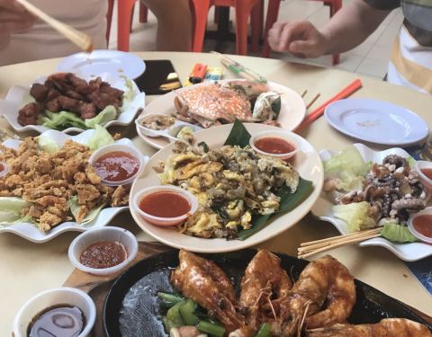 沙爹串、槟城炒粿条非常好吃、福建卤面和虾面、蚝煎、烤鱼烤虾、肉骨茶、印度煎饼、泰式咖喱、冰椰子...