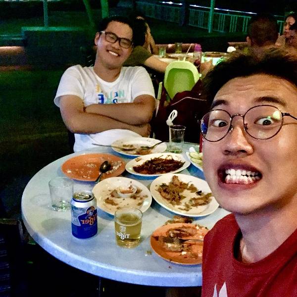 兰卡威的最后一夜,我们打算好好喝点~来到了阿伟给我们推荐的他经常来的大排档,名字叫欢乐天。已经半夜十点多了里面还桌桌爆满,基本全是当地人和熟客,说实话这么不起眼的点名和接地气的环境我自己挑估计是不会来的,不过阿伟良心推荐我们还是决定等会,过了大概10分钟才有我们的座位,这里的海鲜价格就没有珍南大街那么高了,味道也没有卓峰的那么惊艳,但是!还是好吃的,毕竟价格便宜了那么多。根据推荐,我们点了一份老虎虾BBQ,一份奶油炒虾,一份炸鱿鱼,一份酸甜口儿的炒肉,一份海鲜炒饭,前后要了六罐tiger。炒肉和炒饭特别棒!可能是口味很中国,快一周没吃到中国菜的我们吃的美喝的美~又一次风扫残云,吃的啥也不剩…在兰卡威最后来一张合影,来马来西亚好几天了,大可爱长得越来越像马来人了🤣🤣🤣 明天我们将启程前往马来华人聚集地:槟城!