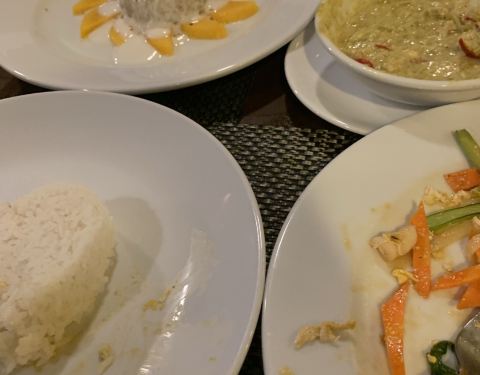 - 吐槽一下主食,红咖喱鸡肉,咖喱汁味道很好,可惜鸡肉不入味,红萝卜、土豆之类的辅料硬邦邦的,口感很差