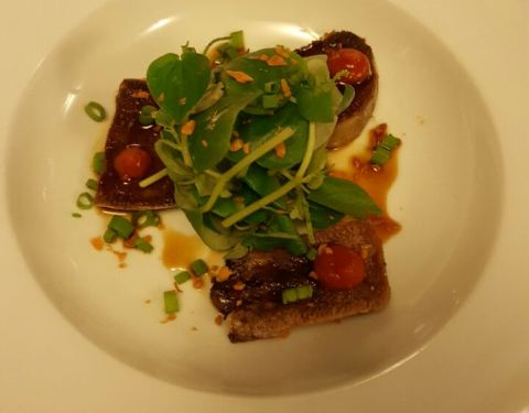 「鸭肉」 有点像油封鸭腿的做法,焦脆的鸭丝和酸甜水果搭配,再撒上一点柠檬汁,口感层次分明。