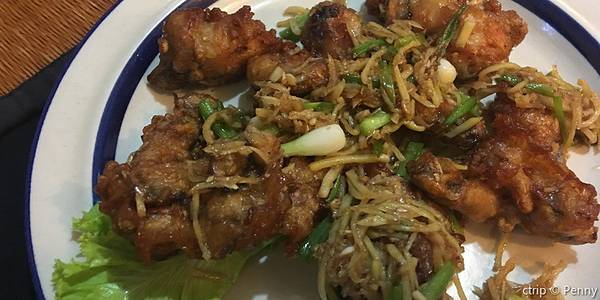 - 槟榔牛肉越吃越好吃,炸虾排太多了有点干。交流起来真的超级舒服想哭!香茅田鸡很棒,味道很清新