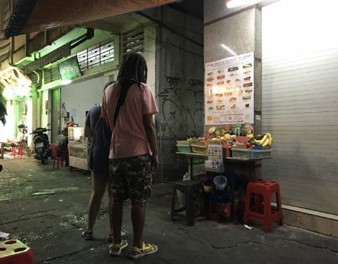 在范五老街的中间,这家真是靠口碑生存下来的,因为是在一条街上面的路边摊,经常坐满人的,摆着各种各样的水果,苍蝇馆子,有一本目录,写下自己想要什么就行,推荐香蕉跟芒果,的确是好喝,牛油果也是不错的