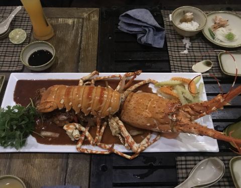 大众和猫头鹰上都推荐的网红餐厅,餐厅开在老城区内一幢黄色的法式独栋别墅内,上到二楼就坐,环境好,服务也好,菜的卖相一般,但味道不错,因为TB,点了龙虾,如果自己去吃,这道菜性价比不高。推荐米粉,软壳蟹,烤鱼,因为点的多,金额高,跟店家商量后送了一份水果拼盘。