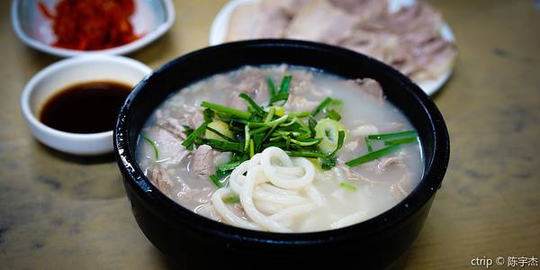 出来旅行,暴走肯定是少不了的,游玩了一天之后,当然要用美食犒劳一下自己。釜山的一大特色美食就是猪肉汤饭,比较有名的就是位于西面的这家,攻略中也有特别多人推荐。交通:1号线西面站1出口,出来直走100米左...出来旅行,暴走肯定是少不了的,游玩了一天之后,当然要用美食犒劳一下自己。釜山的一大特色美食就是猪肉汤饭,比较有名的就是位于西面的这家,攻略中也有特别多人推荐。交通:1号线西面站1出口,出来直走100米左右看到有一条巷子就转右,门口有个大锅,可以看到招牌右边有很多家电视台的采访记录。店铺也很大,用餐的人也很多。猪肉汤饭:6000/份,店员都会用中文说猪肉汤饭,应该很多中国的游客来这里,你只要点头就点餐成功了。店内没有中文菜单,想吃其他的也不太好点,感觉店员也是一直在制作汤饭这一道美食,所以就点了两份猪肉汤饭。店里的这面墙上,有很多明星的签字,验证这家店不仅是游客最爱,当地人也是很多来吃的,不过也没分辨出都有哪些明星,全都是韩国的明星。上菜速度很快,即使店内有很多人在用餐。猪肉汤饭,顾名思义,将米饭加在滚烫的汤,米饭就会比较粘稠松软,伴随着还有独特的酱汁,酱是提味神器,她们的汤味道也是淡淡的,加入酱后有点类似于拌饭的味道,在冷冷的冬日,入口却是暖暖的。