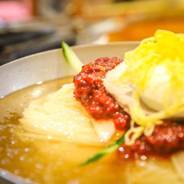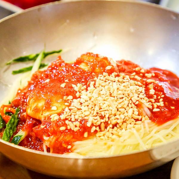 通常名叫“冷面”的店里卖的只有冷面、拌面和蒸饺三道菜。大米磨成粉后做成的面劲道且易消化,成团的面放在加了冰块的牛肉汤里,码上辣酱、叠上一大块清淡的牛肉片、再摞上半个鸡蛋、撒上几绺豆筋丝,在三伏夏日里的韩国,大概想不到比冷面更爽口的食物了吧。