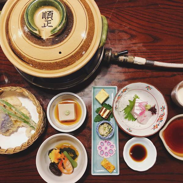说到豆腐料理,起源于中国,后由遣唐使传入日本,成为日本百姓也可以享受到的佳肴。而京都的豆腐由以南禅寺闻名,顺正本店更是位于南禅寺的百年名店,为了一扫琉璃光院的失利,我们早早的来排队一饱口腹之欲。 五点半到达顺正的时候店门口已经排满了人,我们拿到了26号,在寒风中足足等了一个小时才得以进店。是非常有日式特色的庭院,幽静又让人心旷神怡。料理主要是以汤豆腐和豆腐皮锅为主,需要按照人数点相应份数的套餐,因为每桌只有一个炉子,所以汤豆腐和豆腐皮锅只能二选一。 店员推荐我们尝尝汤豆腐,我们点了一份汤豆腐套餐,一份豆腐脑套餐。 先说汤豆腐,嗯,可能我和麻麻真的是俗人一个,完全没有get到淡淡柠檬水煮豆腐的惊人之处。豆腐本身的确很滑嫩,但习惯了东北卤水大豆腐拌小葱蘸蒜酱口味的我们来说,这个小清新版吃的我们真的很难受。套餐的小菜和天妇罗等等也是平平,听着旁边日本食客时不时发出的惊喜之声,我和麻麻真的哭笑不得。 豆腐脑套餐倒是有些和我们的胃口,很浓郁的勾芡和香菇的味道相得益彰。 我和麻麻出于对店家的礼貌和在寒风中等待一个小时的敬意,还是把这一桌吃光光。日本的第一天过的有点意外的惊喜了~五点半到达顺正的时候店门口已经排满了人,我们拿到了26号,在寒风中足足等了一个小时才得以进店。是非常有日式特色的庭院,幽静又让人心旷神怡。料理主要是以汤豆腐和豆腐皮锅为主,需要按照人数点相应份数的套餐,因为每桌只有一个炉子,所以汤豆腐和豆腐皮锅只能二选一。 店员推荐我们尝尝汤豆腐,我们点了一份汤豆腐套餐,一份豆腐脑套餐。 先说汤豆腐,嗯,可能我和麻麻真的是俗人一个,完全没有get到淡淡柠檬水煮豆腐的惊人之处。豆腐本身的确很滑嫩,但习惯了东北卤水大豆腐拌小葱蘸蒜酱口味的我们来说,这个小清新版吃的我们真的很难受。套餐的小菜和天妇罗等等也是平平,听着旁边日本食客时不时发出的惊喜之声,我和麻麻真的哭笑不得。 豆腐脑套餐倒是有些和我们的胃口,很浓郁的勾芡和香菇的味道相得益彰。 我和麻麻出于对店家的礼貌和在寒风中等待一个小时的敬意,还是把这一桌吃光光。日本的第一天过的有点意外的惊喜了~