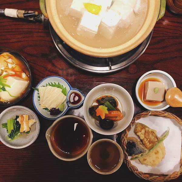 到了京都就得尝一下有名的豆腐料理,而提到豆腐就一定会想到这家。豆腐火锅套餐,食材里用了很多豆制品,其中主打的汤豆腐火锅,鲜滑嫩软,清汤煮着豆腐,入口之后能感受到原汁原味的豆腐。如果觉得口味不能接受,还可以蘸着盐或者特制酱油品尝。