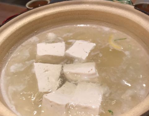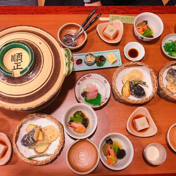 我和麻麻出于对店家的礼貌和在寒风中等待一个小时的敬意,还是把这一桌吃光光。日本的第一天过的有点意外的惊喜了~五点半到达顺正的时候店门口已经排满了人,我们拿到了26号,在寒风中足足等了一个小时才得以进店。是非常有日式特色的庭院,幽静又让人心旷神怡。料理主要是以汤豆腐和豆腐皮锅为主,需要按照人数点相应份数的套餐,因为每桌只有一个炉子,所以汤豆腐和豆腐皮锅只能二选一。