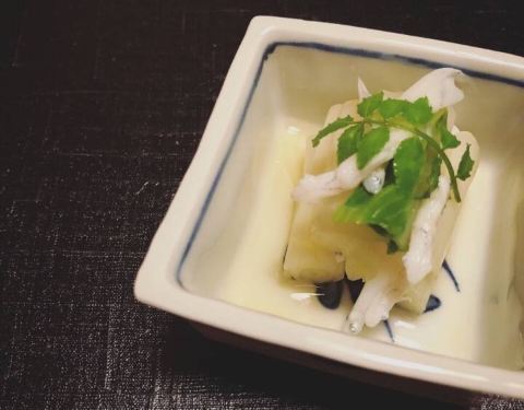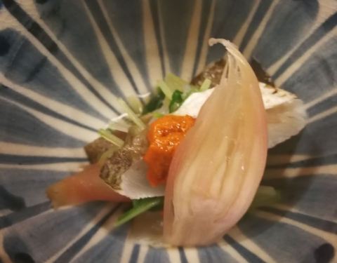 - “冷物”是山菜加白鱼,山菜很脆爽,白鱼可能因为本身很细小,所以口感欠佳又不鲜。味舌料理