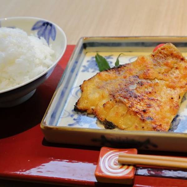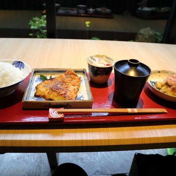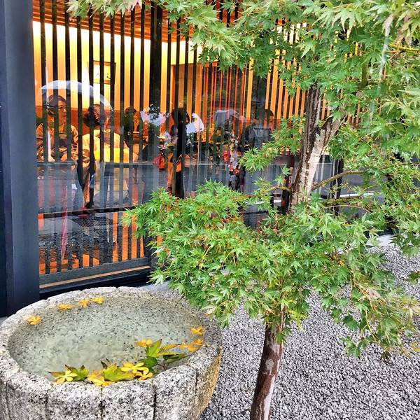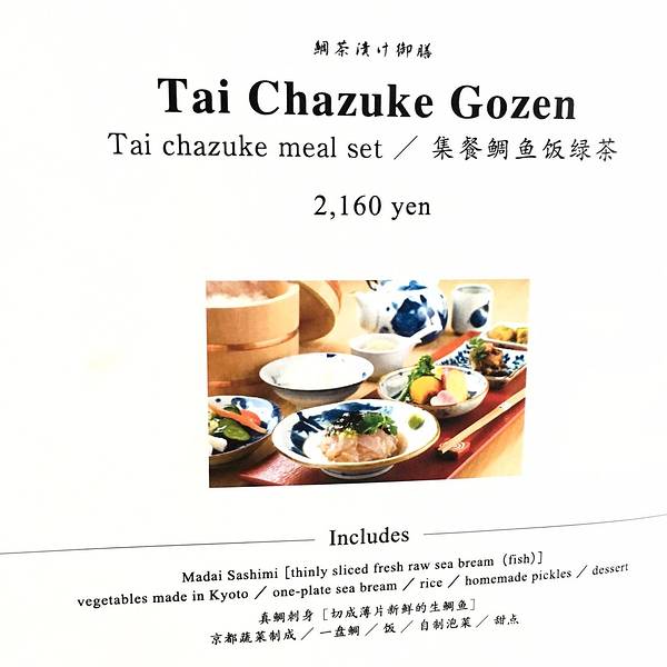 门外的枫叶,配着雨景拍出来超上相~~去的时候虽然没到12点,但却排起了长龙,排队时候发现就我们一对外国友人哈哈哈~~心里暗喜,又找到对地方了。前面大约有7-8桌,等了将近半个小时还是40分钟才进去~~其实他们只是节奏慢,等待的时候发现里面空了好几桌,就是不让进,一个是服务员没打扫好,还有一个可能就是后面的主厨没做好。因为在你等待期间,服务员会给你出示菜单,提前制作,等你进去时,等不了10分钟就能上齐。菜单一共三个套餐,选的最多的就是我发的这两个,一个是集餐西京烤套餐,一个是集餐鲷鱼饭绿茶套餐。一熟一生,熟的是将白味增腌制好的鲷鱼肉进行烤制,搭配蔬菜、真鲷蛋羹、泡菜、米饭、味增汤和甜点;生的是切成薄片的真鲷刺身,就着店家特色配方调制好的酱汁(吃法很讲究,后面细说),套餐里含蔬菜、泡菜、一壶茶和甜点。集餐鲷鱼饭绿茶套餐里面的配菜会比集餐西京烤略少,没有酱汤、没有蛋羹、没有小沙丁鱼,价格便宜110日元。给大家建议是,两个特色都要点,尝一尝很有必要。店内的用餐环境:清幽,讲究,处处透漏着京都这个城市的细腻和温婉店里刚吃完的和服妹子,在外头开始排队的时候就注意到她俩了,细嚼慢咽,米饭按粒儿吃,一点东西,他俩足足吃了一个多小时,也只有这么吃才能对得起这身昂贵的和服吧~集餐西京烤这个套餐很适合忌生冷的女孩子点,烤制好的鱼肉还冒着热气,如果再冷的话吃着一定很舒服,毕竟前菜还有一碗热呼的开胃汤,饭中有一碗味增汤,保证吃的暖暖的。 经过白味增胭脂后的鱼肉,自带烟熏的味道,味道有些像火腿,但在咸味的基础上又带着丝丝甜味。鱼肉的肉质像蒜瓣肉,一层一层的,能看到明显的层次,很鲜美。很大一块,咸味略咸,非常下饭。提供的应季时蔬清淡,搭配鱼肉和米饭一起送入嘴里,咸度刚刚好。腌制好的泡菜有咸、辣、酸,不同的菜品会有不同的味道。我这个套餐还包括一份木鱼屑茄泥,茄泥清淡略甜,凉丝丝的,爽口。鲷鱼蛋羹被服务员失误放到了下面的真鲷套餐中,蛋羹蒸的超级完美,简直就是艺术,像布丁一样嫩滑的外表,口感混入鱼肉的鲜美,升华了。等真鲷这个套餐上了之后才是真正的美食盛宴,美食艺术,从摆盘,再到口味,色香味俱全。真鲷套餐的吃法非常讲究,可谓一餐多吃。 第一步:生吃。直接食用浸满自制芝麻酱的鲷鱼刺身 第二步,把自制芝麻酱的鲷鱼放在米饭上吃 第三步,茶泡饭。将芝麻酱、鲷鱼刺身放入米饭碗中,倒上茶水享用。 第四步,品尝和果子真鲷刺身肉质极其鲜美,端上来时鱼肉浸泡在麻酱汁中,桌旁配有芝麻,撒入之后一起吃进嘴里,鱼肉虽然嫩,但却不软糯,有嚼劲儿,炒芝麻的香和芝麻酱的咸香更加提升了鱼肉的鲜美,如果觉得味蕾还不够刺激,得不到提升的话,旁边有芥末,可以加入一点点在芝麻酱中。两个套餐看似不多,精致的摆盘却占了整整一张桌子,远处的木桶里是米饭,差不多是6-7碗的量,即使鱼肉吃完,套餐里面的泡菜也足够你吃两碗米饭的了。1米85的周先生饭量不是盖的,鲷鱼和麻酱拌饭就吃了两碗饭,犹记得最后添了五次,要不是我阻拦,木桶也快被他吃了吃完之后服务员会及时帮你撤掉所有盘子,端上来餐后甜品和茶。这样的意境下,品着热茶,看着窗外的绿植,听着雨声,惬意。再来张回眸~~吃完之后再出来快2点了,店外已经没那么长的队伍了,差不多有4-5桌人。看来这家店还是相当火爆的。