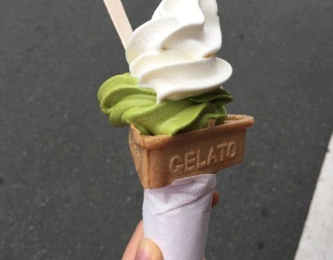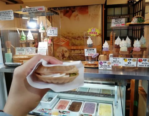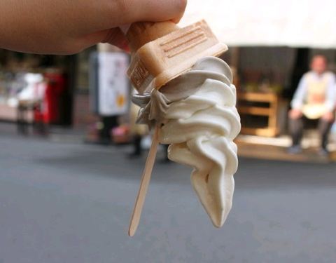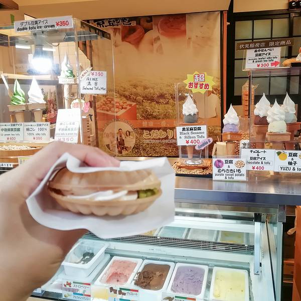 从伏见稻荷大社出来往公交站走的路上,途径一家冰淇淋店。主打豆腐冰淇淋,冰淇淋软软滑滑,有种豆子的香味。冰淇淋有两种可选,一种是传统的类似麦当劳甜筒那样的,还有一种是中间放个别的味道的冰淇淋球的。如...