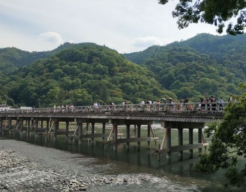 导游介绍的网红咖啡店,沿河经过渡月桥往前走一小段路的路边,很好找,直接看很多人排队的地方就是了。 店堂超级小,基本没有堂坐的位置,据说堂吃是要加费的。服务生正如导游介绍的,一色的俊男靓女,很养眼喔。咖啡还是蛮香浓的,拿了一杯漫步河边,对着青山绿水,品味惬意人生。