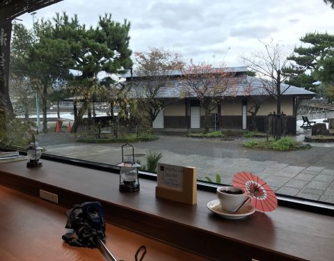在渡月桥头,岚山公园下,坐在玻璃窗前看来往的行人与湍急的河水、门口的青松。咖啡不贵,大概四五百日元一杯,还有小蛋糕。还有免费wifi与免费充电。