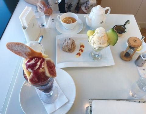 到达京都的第一餐,选择午饭时间来吃甜品,顺利躲过高峰不用排队!听说是京都本地人十分喜爱的甜品店,就在伊势丹6楼!白色简约的环境,窗口位置可以看到京都塔,天气好心情更加好! 点了一份蜜瓜芭菲配蒙布朗,蜜瓜虽然是网纹瓜,但并不是很甜,如果想吃甜如蜜的软糯蜜瓜、一定要去超市买富良野的,真的炒鸡好吃,价格也比静冈的便宜很多! 日式蒙布朗,感觉轻巧很多,配蛋糕底,感觉更喜欢法式的蒙布朗配糖霜! 另外点了一份季节限定的无花果芭菲,里面的芝士蛋糕和红酒冻十分好吃! 超喜欢这家店的原因,就是可以看到很多京都本地女性,十分精致美丽!有穿和服的,有七八十岁却依然精致的奶奶们,带着珍珠项链耳钉,涂着红唇,穿着笔挺的套装,坐在那里优雅滴吃着甜品! 等吃完出来,门口已经排了很长的队啦!所以想吃就选午餐时间,绝对不用排队哈!