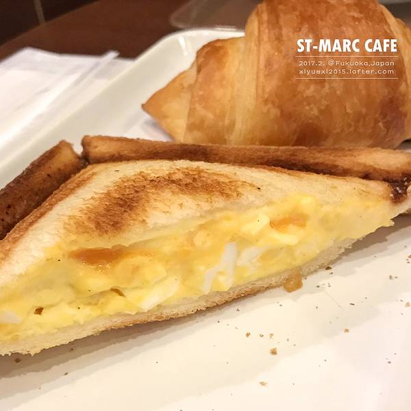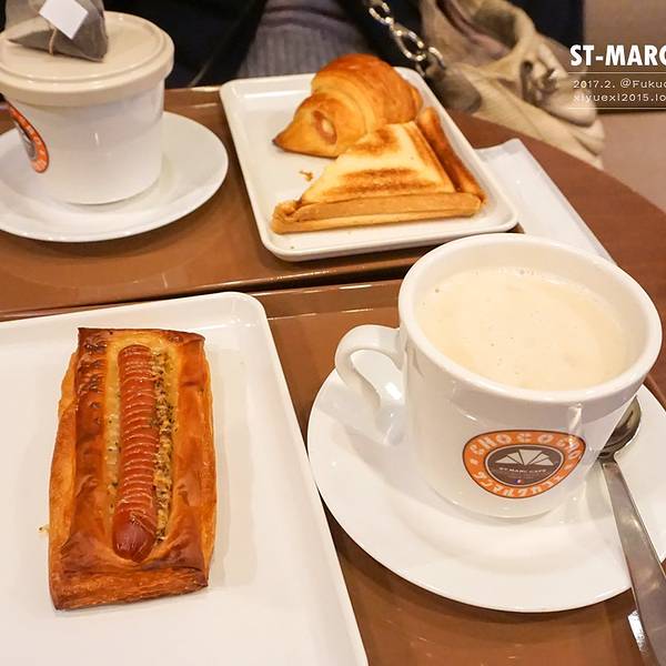 吃:ST-MARC CAFE(早餐) ST-MARC CAFE #坐标:日本福冈 博多运河城 来日本的第一顿早餐。据说日本的面包水平比较高,果然不假。 日本连锁咖啡馆,超级多分店。面包好吃,价格实惠,性价比之选。每天早晨店里都有一款特价早餐组合,面包+咖啡or茶可以优惠100円,当天的特价就是带香肠的那款。 买了三种面包都是200日元。最喜欢的是三角形的鸡蛋吐司,蛋味超香,中间有着溏心蛋一般的口感与吐司绝配。连吐司边都做的又香又脆,这部分平时我吃吐司都扔掉的。可颂和带香肠的酥皮面包稍微有点油,味道也不错。 另外还点了一杯汤,我开始以为是速溶汤,实际上料超级足,照片上看不出。里面有培根有蛤蜊有蔬菜,味道也很好喝。吃完我妈就说有没有卖,好想买回去。柜台里的巴菲看着也好诱人呢。