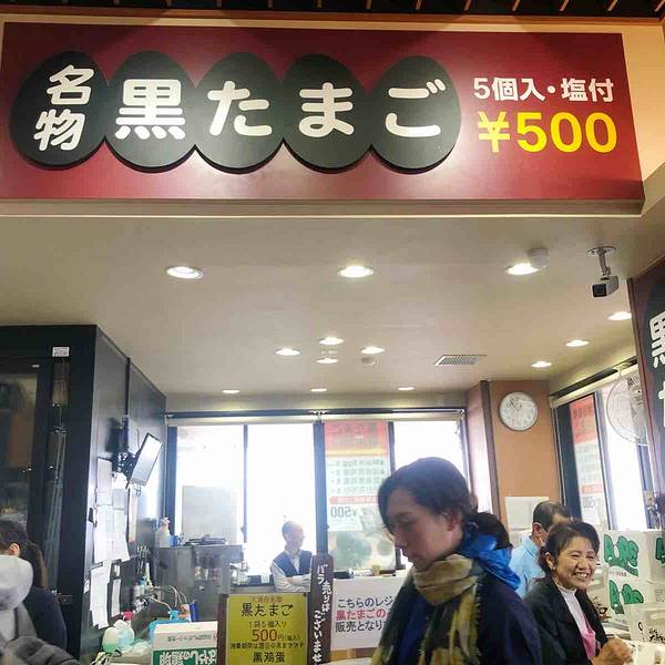 玉子茶屋大涌谷上面的观光中心,有很多手里卖,产品很丰富的啦。 由于大涌谷是箱根地区最热门的一个景点,游客十分多,而且密度最大的就是这个地方了,挤满了人啊。稍微看了一圈就走了。 门口处有卖当地最特色的黑鸡蛋,500円/5个。基本不用排队,动作很迅速的。包装的不错,当场吃了两个。 反正这个黑鸡蛋说的对身体很有好处,就是白煮蛋的做法,因为当地的环境蛋煮出来外面是全黑的,里面就是白煮蛋啦,蛋吃上去还是蛮香的。