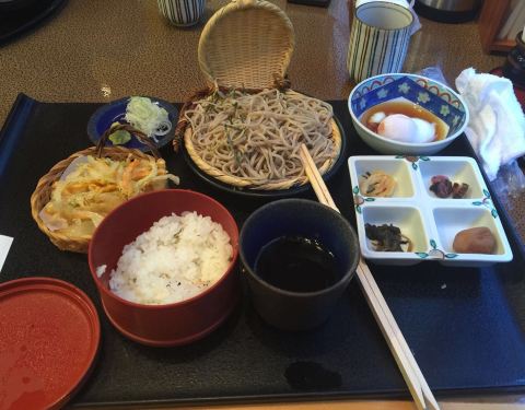本店靠近箱根汤本站,提供定食、荞麦面、海鲜盖饭等日式大众美食,性价比非常高。店内最有人气的美食是荞麦面套餐,荞麦面上撒上海苔丝,味道非常棒。