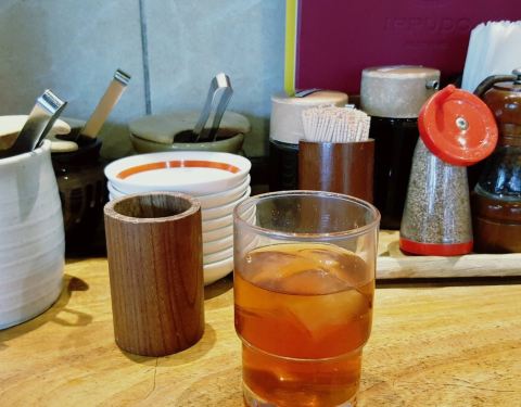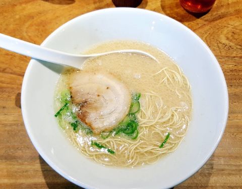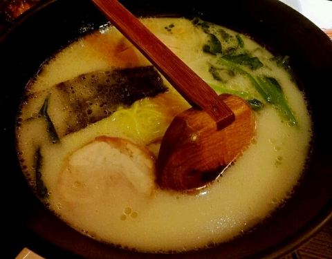 博多一风堂的白汤拉面虽也汤底浓郁,面条细韧,但咸味重了些,吃过后口里发干。叉烧薄薄一片,肥瘦相间,但肥肉居多,口感一般。磨一点芝麻粉或胡椒粉,加些拉面酱油,则又增添了些香味。