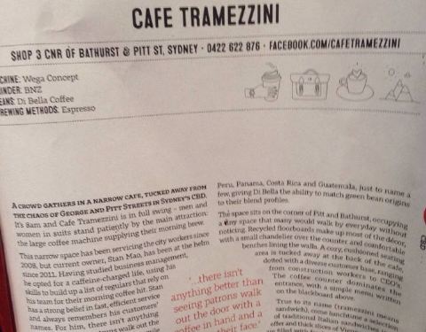 Cafe Tramezzini,挺文艺的咖啡店呢,悉尼倒是真的没有多少星巴克costa太平洋之类,都是这种比较文艺的小咖啡店