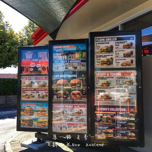 Burger King汉堡王 新西兰随处可见快餐店,麦当劳,肯德基和汉堡王。其中汉堡王的分店最多,每个地方都能看到。套餐价格一般是10钮币到20钮币之间。我最喜欢他们的沙冰,只要1钮币,有可乐味,芬达味,哈密瓜味,...