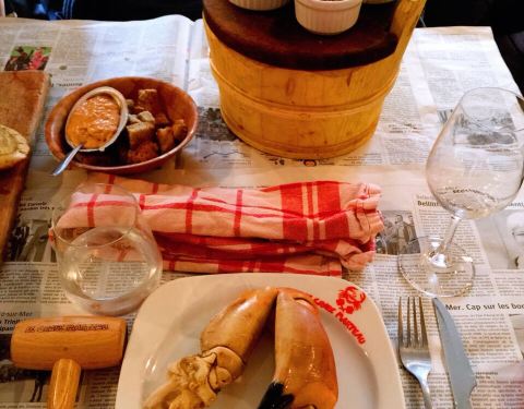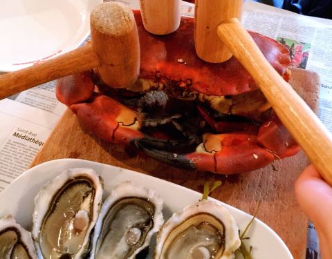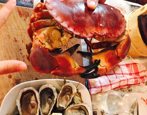 电影里,在码头的岸边上通常会开有这样一家小酒馆: 它的地板、桌椅、柜台一定都是色彩浓重的木质,就像是一艘扎根陆地的船;它的前台摆满了各种酒,它也将渔船上有的东西,诸如救生圈、渔灯等都搬到了酒馆内。 每天傍晚渔民收渔之后,会先在这家小酒馆里喝一杯,唠叨一下今天的收获如何,之后再回家。 Le Crabe Marteau便是按着这个模子刻出来的。 只不过它的菜单主角是螃蟹,而顾客则在渔民之外,还多了慕名而来的远方客。 而更有意思的一点是:Le Crabe Marteau桌上铺着的“桌布”是布列塔尼的地方性报纸法国西部报OUEST-FRANCE。 据说,用它做桌布,能使待会就要端上来的螃蟹吃起来更具布列塔尼风味。 如何豪迈地吃一只螃蟹 倪好 · 布列塔尼 Le Crabe Marteau内没有固定的菜单也没有储存海鲜的冰箱—— 你到餐厅之后能吃什么根据当天捕捞到的海鲜而定。而从海鲜被捕捞起到端上桌,中间的这段时间往往不会超过24小时,所以即使没有冰箱也能保证食材的新鲜。 在Le Crabe Marteau吃螃蟹,有两样工具少不了:一个是用来砸螃蟹腿的锤子,另一个是系在胸前的围兜。 餐厅的螃蟹体型甚大,据说来自深海,也较少活动,所以浑身储满了蟹膏,吃起来细腻绵密,入口即香。 藏在蟹钳内的蟹肉则是另一番滋味。吃的时候需要先用锤子将外面的硬壳砸碎,之后便能吃到鲜嫩甜美的蟹肉。 而吃螃蟹也有很多搭配的吃法:比如搭配香槟,让香槟的酸度降低蟹膏的腻滞感,同时也带来另一种特殊的香味;再比如搭配餐厅微辣的酱汁,在丰富口味的同时又不抢去蟹肉的鲜味。 除了主角螃蟹之外,Le Crabe Marteau的其他食物也同样美味。 比如生蚝。肉质洁白肥嫩,口感爽脆,吃起来在鲜咸中又有浓郁的蚝味。 比如龙虾。在对半切开后,撒上胡萝卜、青豆以及香料一起烘烤,蔬菜的鲜味与香料的芳香被一齐催入肉中,所以吃进去的每一口都别有风味。 而主食也很丰富,除了传统的面包之外,还有用木桶装着的土豆和带着螃蟹味的黑麦团可以选择。 第一个吃螃蟹的人,或许确实可以算上是一个勇士,但在具备了勇气之外,他还应当是个擅长发现的人——擅长发现大自然毫无言说便给予我们的美味。 毕竟谁能想到这种“双螯八足,形状凶恶的甲壳虫”,在坚硬的外壳底下竟藏着如此丰腴圆润、丝丝鲜嫩的美味呢?