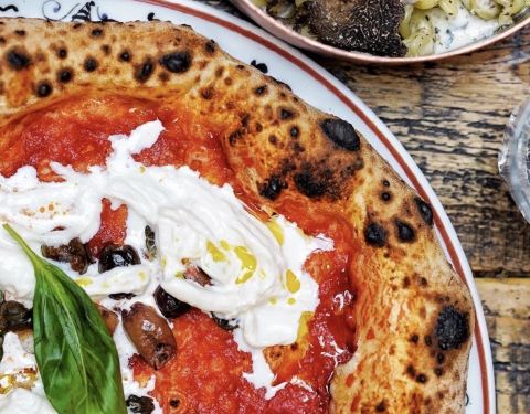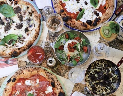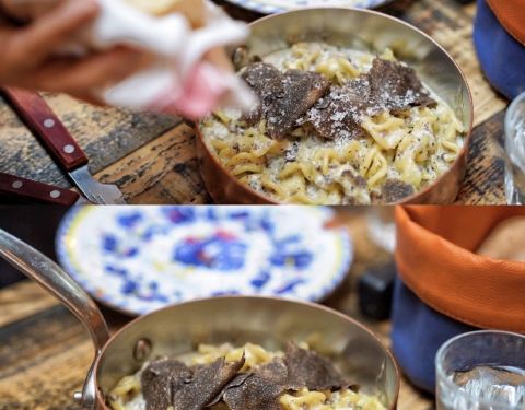 食物味道、团队颜值、餐厅环境,深刻印象。服务生的T恤是特制的,每人专属肖像T恤。 我们选择坐在了开放式厨房旁边,能够更加清楚的看见厨房的操作,听着里面传来一声声的意大利语,完全感觉不到自己在巴黎了。 另外,他们家菜量有一点大,披萨一份两个人吃刚好。 【生牛肉夏季沙拉】本地生牛肉切火腿薄片配当季甜油桃、苦苣和法棍薄脆在清新甜美味道中增加了爽脆口感,新鲜的组合,奇妙的味道。 【那不勒斯披萨】纯粹意产的圣玛扎诺西红柿酱配上马苏里拉水牛奶酪,那不勒斯作为意大利披萨的圣地,也是没什么必要再清晰描述了。简单纯粹无杂味,好食材的呈现总是异常的坦率直接。 【黑松露意大利面】除了黑松露还是黑松露,几米开外的距离已经要急于宣布它来了。每一口都是满满的黑松露香气,值得一提的是面体的熟度,刚刚好保持了口感劲道和硬芯,曲折的宽面更多的吸满黑松露香气。