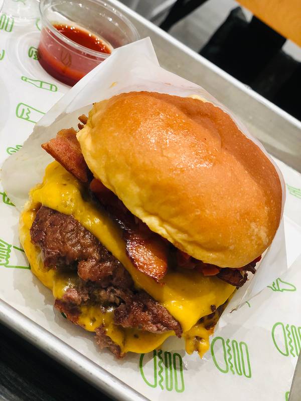 整体非常非常的甜,配上士多啤梨稍微中了了一点点🤏甜味 但是吃两口就还是挺齁甜齁甜的...Smoke Shack 要的double的肉 上层是苹果木熏烟肉,培根🥓烤的焦脆,能吃出烟熏的味道。熏肉上面是红色的樱桃辣椒,基本不辣酸酸咸咸的,配着肉一起吃非常解腻