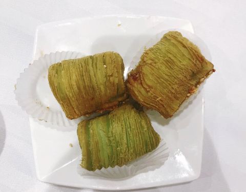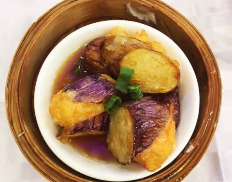 - 打卡这家早茶,感觉有好多不算太常见的点心。比如三鲜味儿的虾饺,虾馅儿的茄子盒,和原谅色的榴莲酥