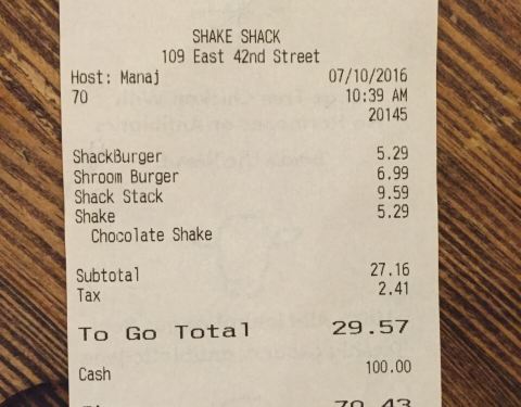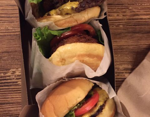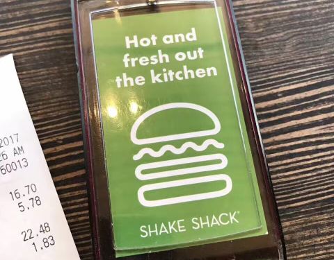大名鼎鼎的shake&shack ,来纽约怎么能不吃它了。住在联合国附近,中央车站下面有一家,去的时候不是饭点,没咋排队,点餐后会给一个牌子,震动后去取餐,餐票上也会打上名字,凭名字和牌子取餐。 汉堡和国内的味...