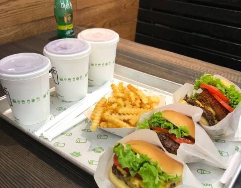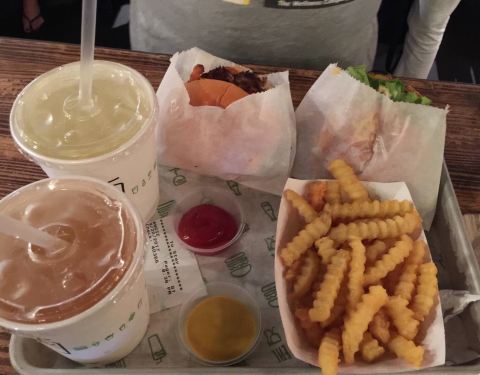 我们出门游玩累了刚好看到一家Shake Shack,于是决定在这里用餐。除了汉堡、热狗、薯条,还有奶昔、冰淇淋、各式饮料等等可以选择。等待时间不算长。他家汉堡的肉质和酱汁很搭,薯条也很好吃且建议加芝士(吃快餐...我们出门游玩累了刚好看到一家Shake Shack,于是决定在这里用餐。除了汉堡、热狗、薯条,还有奶昔、冰淇淋、各式饮料等等可以选择。等待时间不算长。他家汉堡的肉质和酱汁很搭,薯条也很好吃且建议加芝士(吃快餐我们就不考虑热量啦,怎么好吃怎么来)。