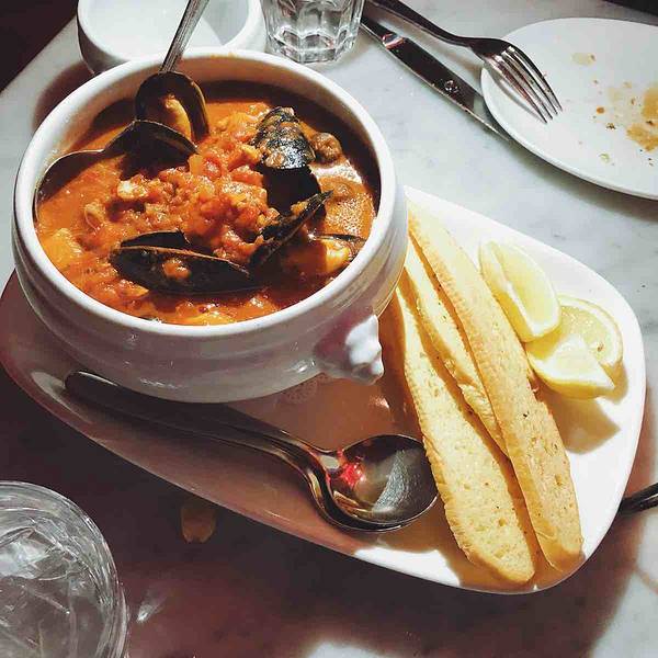 旧金山的朋友带着来的 晚上8点 还有人在排队 不过没多久就坐下了 平时的话最好预约 否则排队挺久 很出名的一家意大利餐厅 以蒜为主题 门外的橱窗里有蒜的吉祥物 店里墙上更是挂着一串串真的蒜哦 也卖各种蒜调...旧金山的朋友带着来的 晚上8点 还有人在排队 不过没多久就坐下了 平时的话最好预约 否则排队挺久 很出名的一家意大利餐厅 以蒜为主题 门外的橱窗里有蒜的吉祥物 店里墙上更是挂着一串串真的蒜哦 也卖各种蒜调制品 菜自然是以蒜为特色。 朋友是广东人 超爱吃海鲜 所以点的两道菜是铁板海鲜和海鲜炖[笑哭] 不过味道都非常赞 和青口贝很嫩 虾的皮已经剥掉了 一口一个爽歪歪 酱汁挺特别 很入味 份量挺足 两个妹纸两份菜就够 甜品在另外的菜单上 吃完主菜可以问服务员要 推荐吃他家独有的蒜味巧克力冰激淋啊 挺特别 两人吃光盘呀 不过晚上睡觉的时候口里还是有股蒜味的[笑哭] 妹纸悠悠的对我说 口里满是蒜味 这个时候好想找个人接吻呀 我下意识的裹紧自己的被子 问 你想找谁[懵逼] 哈哈哈哈哈 放心 不会找你啦[吐舌] 哈哈哈哈 那么以后找了男朋友 一定要带他来这里呀[机智]