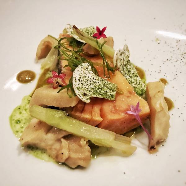 据说是米其林餐厅哦。对他们讲当然是希望高高啦。而且也没让我们失望了。主食选择了三文鱼啦。摆盘就非常精致啦。上面的芦笋超级甜哦。