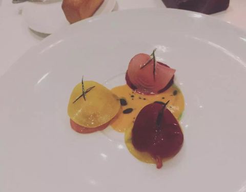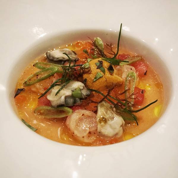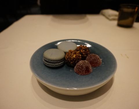 此行最重要的一餐定在了LA 大名 鼎鼎的海鲜料理PROVIDENCE,米其林二星餐厅。落座后会先提供酒水单,光从酒的种类之多,就能体会到餐厅主厨的用心了。海鲜冷吃盘,虾+生蚝+海胆+鱼子+三文鱼,十分鲜美。蘑菇酱剑鱼,感觉吃的一定是一坨鱼肌肉炒鸡Q弹,蘑菇酱鲜甜。烤鸭肉,火候适中没有腥气肉汁饱满。烤Tuna,因为不爱吃鸭肉所以选了Tuna,并没有听懂其他的辅料是什么,酱料微微发酸,中规中矩。甜品要给10分好评,口感层次之丰富,连我这种平常美食的渣渣都能感觉到其中的奥妙。坐着聊天的时候,服务员还给上了一些糖果。