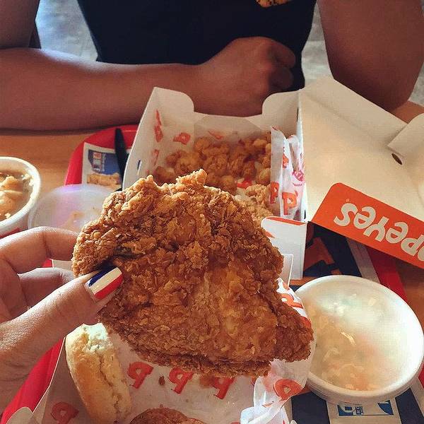 今日午饭依旧是Popeyes 这样大家应该知道我们多喜欢吃它了吧! 到了的时候,下来一车的旅行团~ 两北京小夫妻找不到位置,我们就让他们一起来拼桌! 然后就聊了起来。 他们貌似是一早就去大峡谷观光完回来的游客...