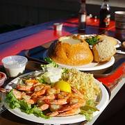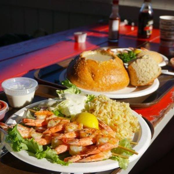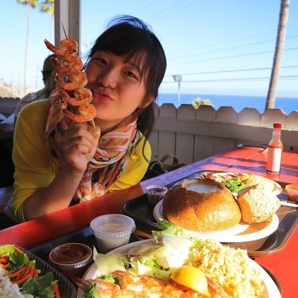 Malibu seafood fresh fish market & patio cafe 地址:25653 Pacific Coast Hwy, Malibu, CA 90265 从旧金山开往洛杉矶,接近马利布海滩的时候,海水最漂亮,瓦蓝瓦蓝的海水如同深邃的女神的眼睛。在马里布海滩,我们通过Yelp搜索到了一家评分极高的餐厅。一间木屋,两个门,一门是in,另一门out。进门就排队,直接点餐,队伍旁边就是沙拉吧和生鱼吧。自动提醒器提醒去取餐,然后拿着食物在点餐木屋旁边的遮阳棚下享受海风与美味。 价位相当平民,我们点了面包海鲜汤、海鲜沙拉、蒸虾套餐,烤虾套餐,只花了59美金。不得不说,这里的口味相当不错,把海鲜做的很好吃。