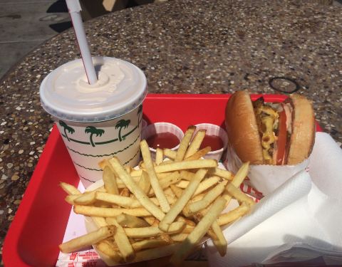- 晚餐在in-n-out汉堡店解决。这家连锁餐厅的汉堡牛肉鲜嫩,薯条由整个土豆切条而成,口味很不错