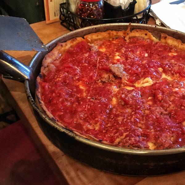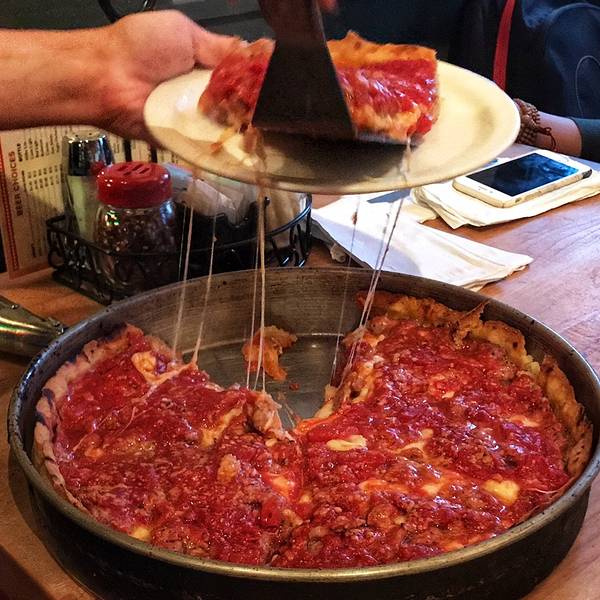 最具芝加哥特色的美食------深盘披萨Deep Dish Pizza 芝加哥美食有三宝: 深盘披萨、爆米花、热狗。尤其不要错过“皮薄馅厚+浓稠番茄味+超足芝士”的深盘披萨Deep Dish Pizza。 著名的餐厅有:Pizzeria Uno、Gino's,Giordano's等。Pizzeria Uno 被誉为深盘披萨鼻祖。奇怪yelp评分并不高。路过,门口大排长龙。 关于这家店:在1943年,Ike Sewell发明了一种深盘披萨(DeepDish),Ike相信如果你做的披萨带有大量的馅料(特别是香肠),它将会成为人们一顿丰盛美食的选择。事实证明他是对的,他开了一家披萨店叫Pizzeria Uno。这是一家专门以深盘披萨为特色的披萨店,并由此开始了芝加哥式披萨现象。 我们选择了深受当地人称赞的Lou Malnati's Pizzeria 人均20-30美元,yelp评分4-4.5分。在芝加哥有 27个 门店,家家都要排队。详细地址建议搜索google地图或者yelp,就近找一家店品尝。