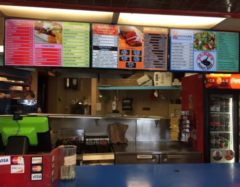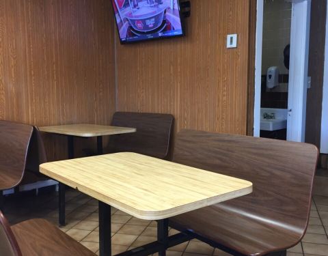 开在干道边的加油站旁边,附近只有一座品质酒店和一栋栋小别墅。餐厅不大,里面就几张桌子而已。经营的汉堡还挺多。现做的烤牛肉汉堡,个头从小到大的分四种,最大的King的,8.55美元一个,个头有盘子大小,够平时两三个汉堡的量,面包里面夹着厚厚的烤牛肉。只是这种牛肉感觉是刚刚断生的,颜色发红,不一定吃的习惯,牛肉堡可以配三种酱,芝士、蛋黄酱、番茄酱,味道还可以,应该是当地人喜欢的味道。餐厅周围基本没有其它餐馆,在附近住或者加油的话,在这里吃。另外餐厅里面有卫生间,可解燃眉之急。