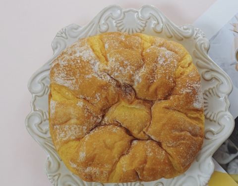 金灿灿的南瓜面包非常柔软,南瓜馅湿润绵密,甜度不高。一心想要南瓜面包,等了半个多小时终于盼到它出炉