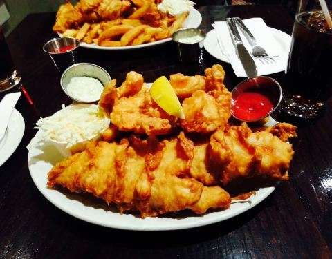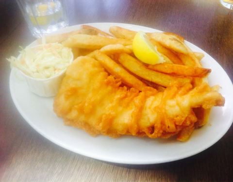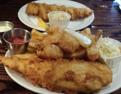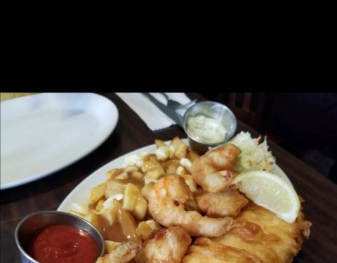 - 类似于英国的特色,里面的炸鱼挺新鲜的,是深海鳕鱼,还有炸大虾味道也很不错,价格还实惠,20多块钱一份