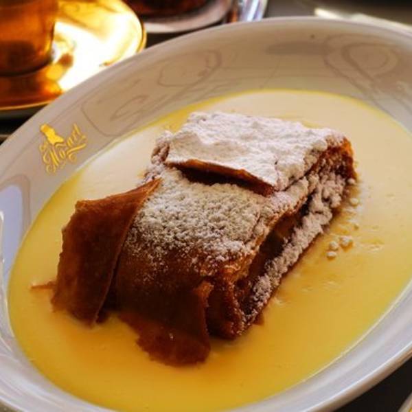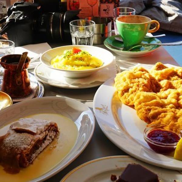 莫扎特咖啡我还是非常推荐的,它是在Double Espresso上加鲜奶油,以及一小罐牛奶巧克力烈性酒Mozart Liqueur(莫扎特酒),整杯蔓延的是浓郁的酒香、巧克力香、咖啡香和奶香,四种味道冲撞在一起,非常浓郁,但一点都不甜腻。苹果派:如果不爱吃太甜的朋友,可以点一份苹果派,味道酸甜,带着苹果的清香,顶层那些脆皮,酥酥脆脆的,配着夹层绵软的苹果颗粒,嚼起来口感丰富,也很有味道。维也纳炸猪排:维也纳人爱这道菜,貌似是他们的国菜,以至于第一天我们强烈的想吃,后面总会因为英语不好,而误点到这类的炸大排头疼不已。