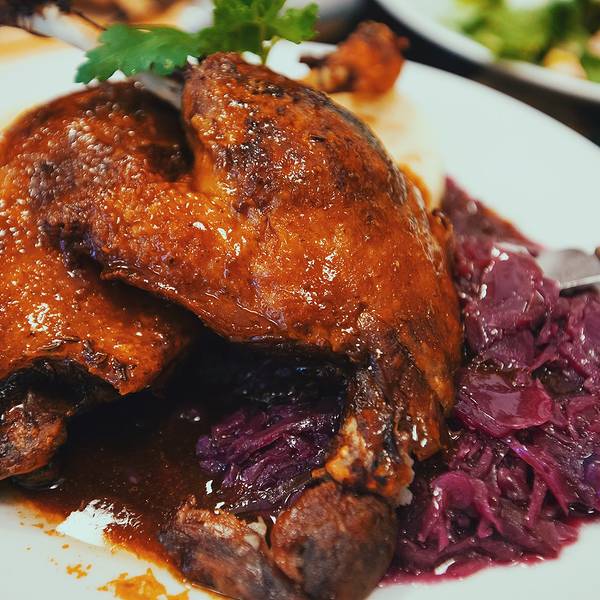 - 捷克 当地的烤鸭也是必点之物,配菜似乎是土豆泥,颜色很特别,口感不错
