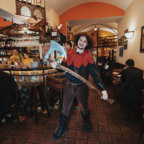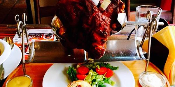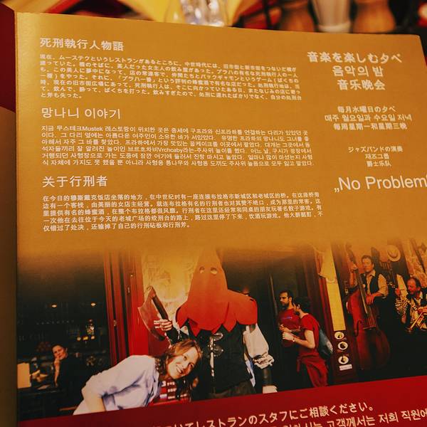 电话: +420-3-602681250店内负责摆拍兼跑趟的小哥,打扮成行刑者的造型,据说这也是这家餐厅的幕后故事:当年有一个著名的行刑者,因为在前往刑场途中在这家餐厅喝酒,结果贪杯忘了自己的斧头,而让这家餐厅名声大噪。这家餐厅大概是国人去的比较多的缘故,菜单也配有中文说明,关于餐厅的典故和渊源也有体现。餐厅外的烤炉中烤着香味浓郁的乳猪,看着就让人食欲大开。猪肘烤得非常嫩,搭配多种酱料让人超满足,再来杯 捷克 传统啤酒更是加分。捷克 当地的烤鸭也是必点之物,配菜似乎是土豆泥,颜色很特别,口感不错。烤肋排香浓可口,但是比起 维也纳 RIBS的烤肋排就差了点,肥肉多,也更油腻。