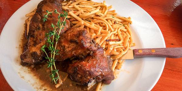 是看了之前网友的图片点的,猪肘子还不错,很有感觉就是太大了,大家分着吃还行!烤兔腿一般,烤蔬菜还不错,啤酒很好。推荐品尝!