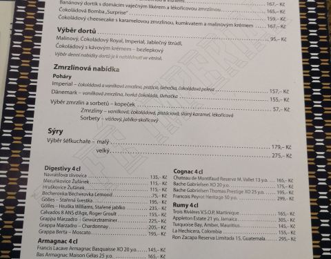 心心念念要造访一下布拉格的甜品店,于是帅哥导游推荐了这家帝国咖啡店。外面看老楼一栋不甚起眼,可门一打开,扑面而来的是一股华丽中透着文艺的气息。因为专程来品尝甜品,于是只点了两客甜点和、咖啡和热巧克...心心念念要造访一下布拉格的甜品店,于是帅哥导游推荐了这家帝国咖啡店。外面看老楼一栋不甚起眼,可门一打开,扑面而来的是一股华丽中透着文艺的气息。因为专程来品尝甜品,于是只点了两客甜点和、咖啡和热巧克力。巧克力炸弹可以说是他家甜品的头牌,吃甜者必点哦!一个看似普通的巧克力球内藏果味冰激凌,热巧克力当场由服务生慢慢淋在上面,"炸弹"爆裂,露出其中奥妙。口味酸甜适度,没有甜腻感,各种味道平衡的很好,棒棒哒!