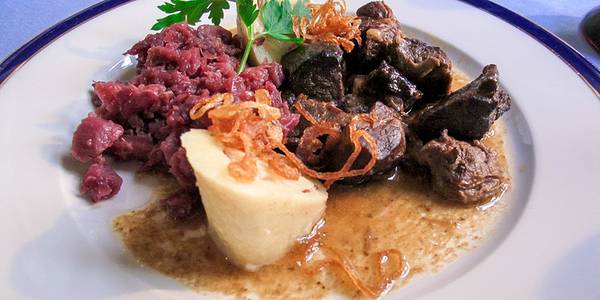 Grilovaný Jelení Hřbet se Šípkovou Omáčkou a Karlovarským Knedlíkem