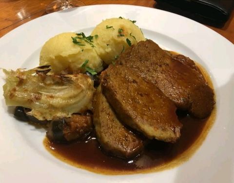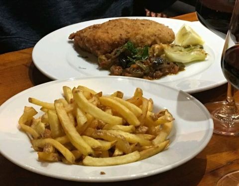 看着有点历史的餐厅,里面的色拉味道挺不错的,小牛排有三块,和图片一模一样,吃的很爽,红酒便宜,可以一杯为单位买,入口挺纯的。