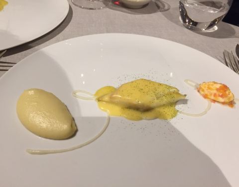 巴塞罗那依山傍海,有着极为丰富的海产资源,加泰罗尼亚名厨 Paco Perez以地中海各季食材为灵感,在传统本地风味与高级料理技艺之间找到微妙平衡。西班牙本地著名的绯红虾,被做成三吃,第一步吃烤干的壳,而后是精致调味的甜美虾肉,最后抓起烤得恰到好处的虾头狠狠吮出虾脑……虾的鲜甜味道层层递进,变化的质地亦带来不同刺激的口感,令人叹为观止。红虾本就生得令人垂涎欲滴,而能如此抽丝剥茧地探索一种食材,用尽每一种表达的可能性,绝非普通人所为。如诗如画的摆盘,亦是可圈可点。配酒方面偏重细腻与优雅,展现出西班牙本土葡萄酒不为人知的新派风格。餐厅位处巴塞罗那海滨,夏季开放的户外景观位,在落日余晖中享用晚餐,实在太浪漫。