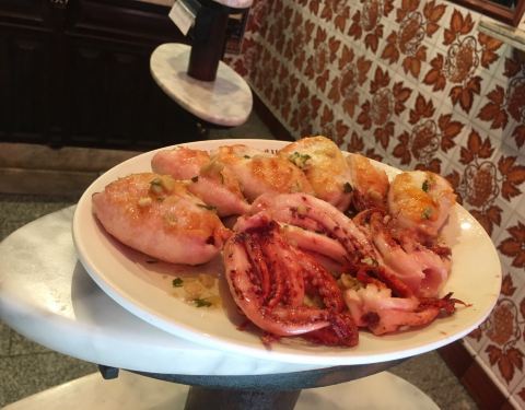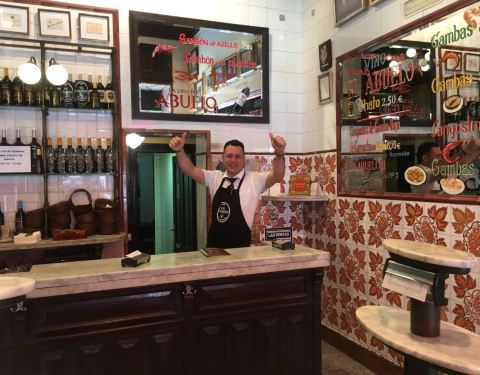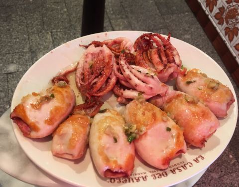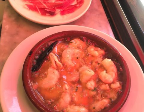 La Casa Del Abuelo建于1906,据说安迪沃霍尔经常光顾这个地方,是爱虾人的天堂。黄油大蒜虾9.9欧元,虾被大蒜和干辣椒的味道浸入。大蒜虾和烤虾最美味,免费提供面包蘸蒜酱,味道浓郁。这里的酒有点甜,一瓶红色的杜尔塞大约8.5欧元。